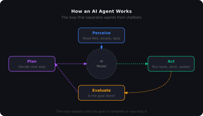 A circular flow diagram illustrating how an AI agent works. Four nodes — Perceive (reads files, emails, data), Plan (decides next step), Act (runs tools, sends, updates), and Evaluate (checks if the goal is done) — connect through a central AI Model hub. Dashed arrows show the loop repeating until the task is complete.